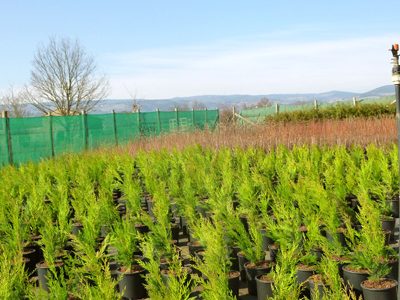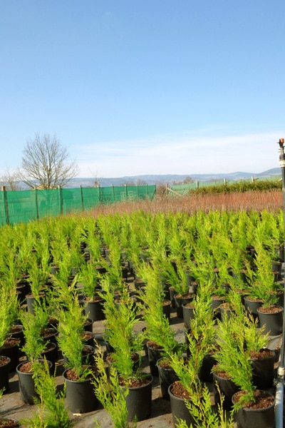 - végétaux en conteneurs : plantes de haies (cyprès de leyland, lauriers…), arbuste à fleurs, arbres fruitiers, conifères, plantes grimpantes.